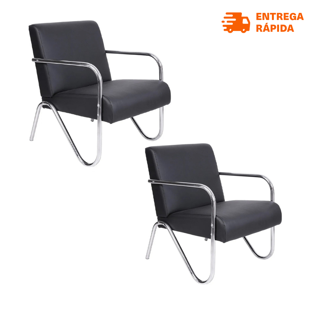 KIt 2 Poltronas Cadeiras Decorativa Estofada Paris Recepção Consultório Sala Corino Braços Alumínio