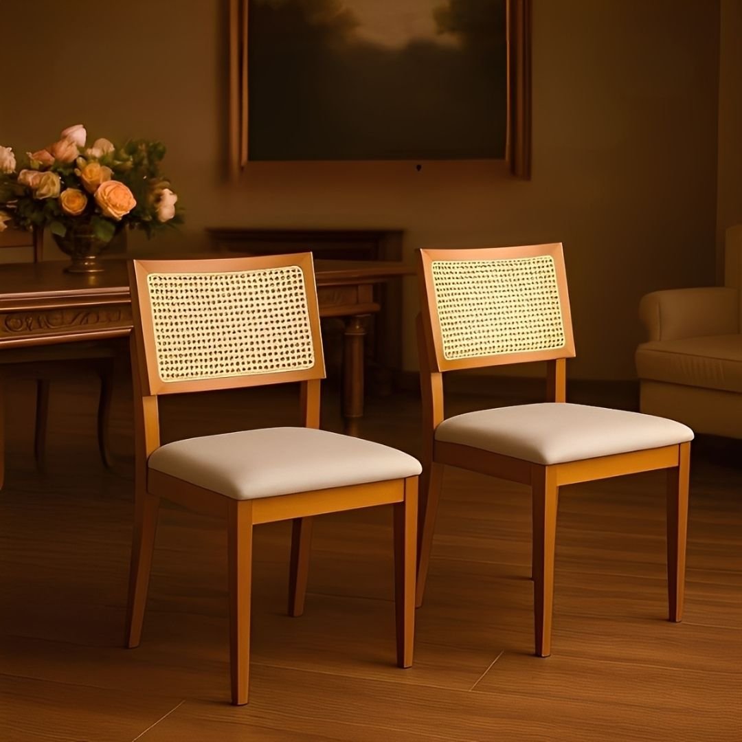 Kit 2 Cadeiras De Jantar Luxo Palha Estofadas Linho Bege Encosto Tela Sextavada Rubi Madeira Maciça