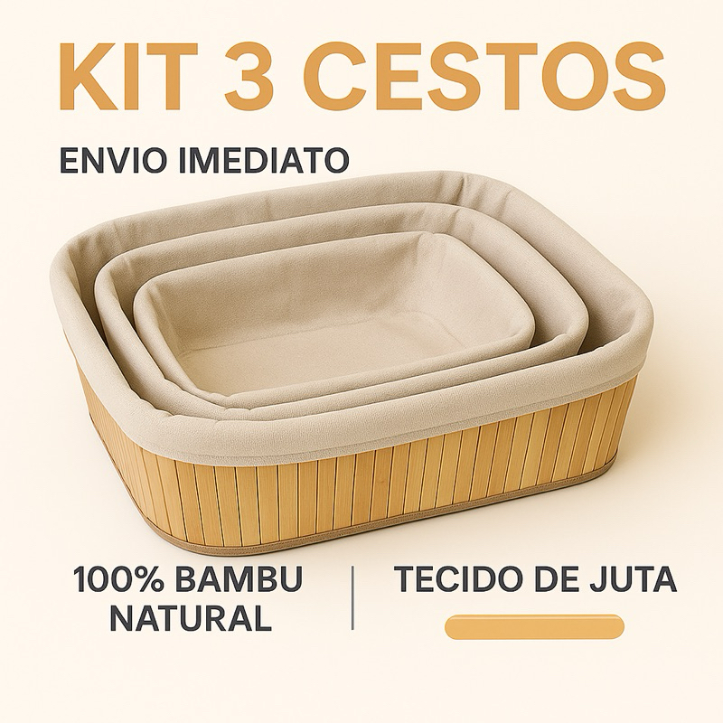 Kit 3 Cestos Organizadores de Bambu Multiuso com Forro