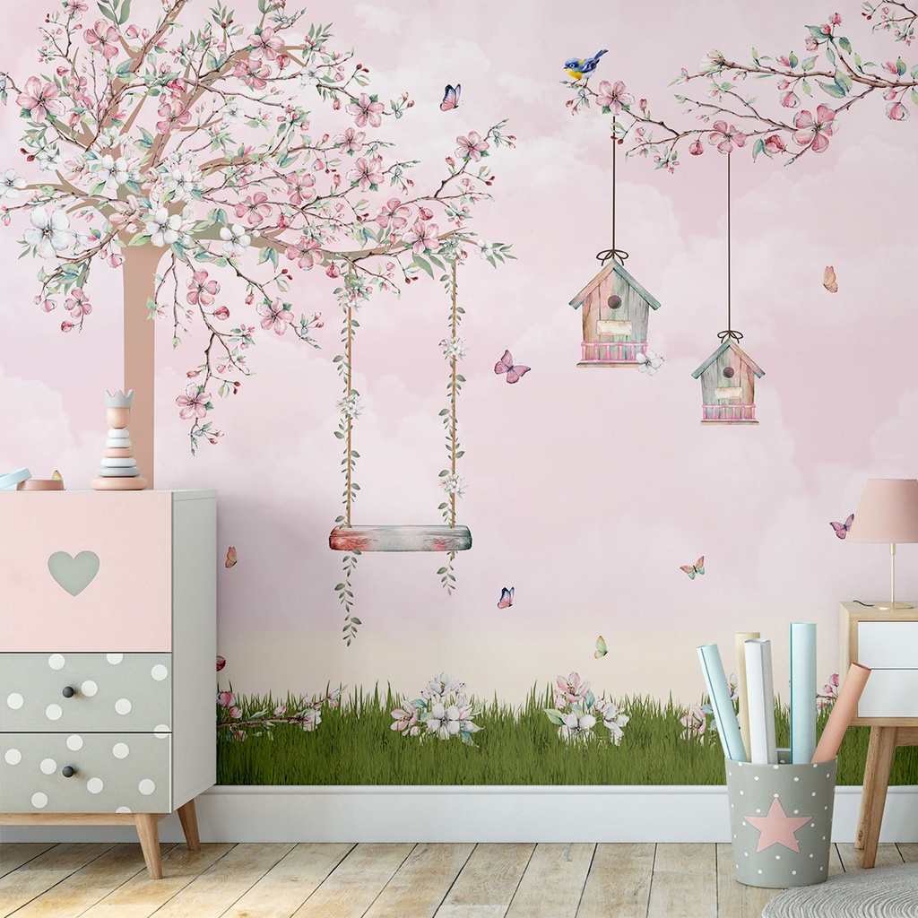 Papel de Parede Infantil Menina no Balanço Árvore de Flores Decora Quarto Rosa m²