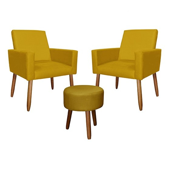 Kit poltrona decorativa nina mais puff redondo amarelo sala ou recepção