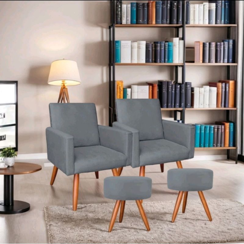 Kit 2 poltrona nina + 2 puff redondo em suede cinza