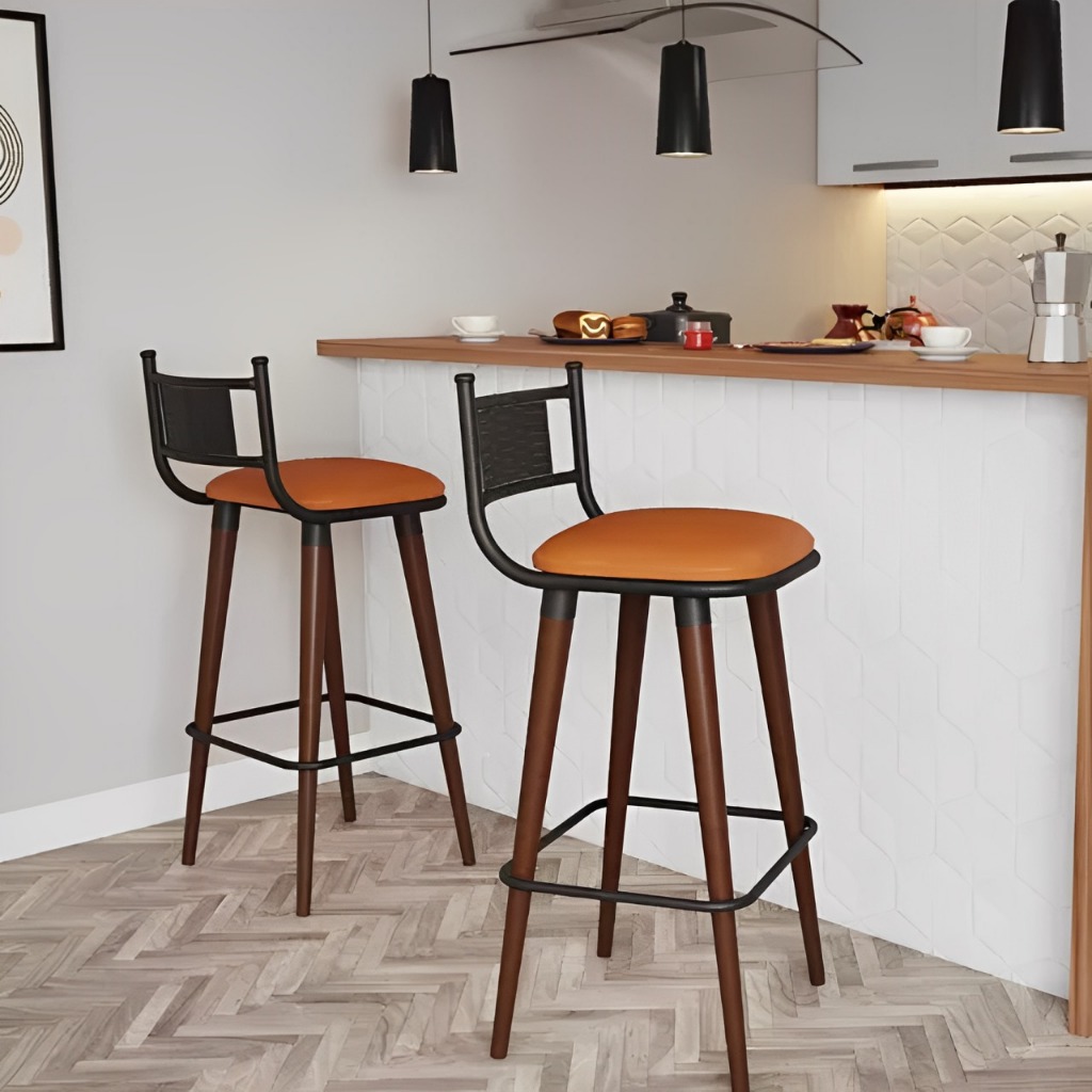 Kit 2 Banquetas Alta Decorativa Com Encosto Para Cozinha Balcão e Bistro Base De Madeira