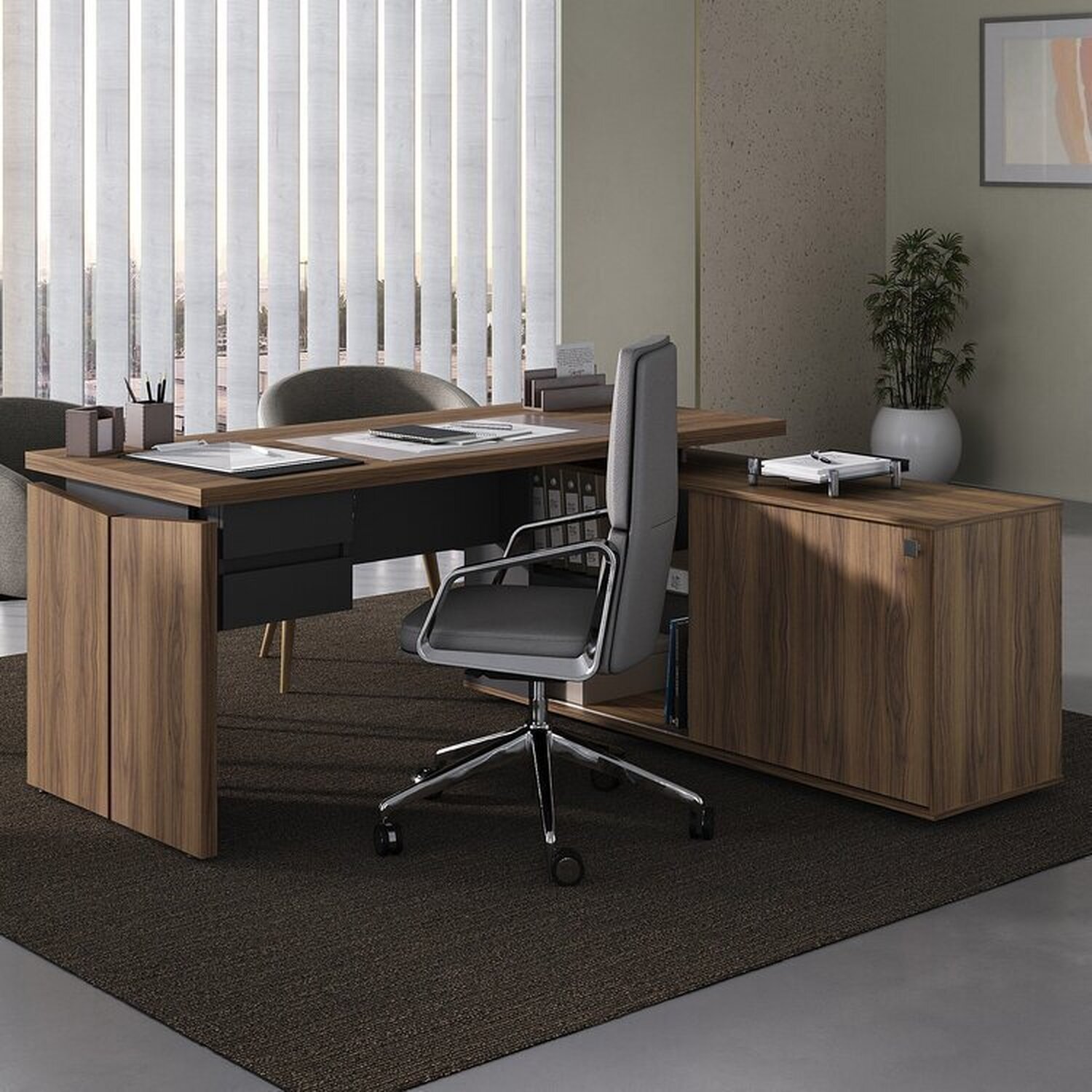 Mesa para Escritório Diretor em L Dinâmica com Armário Lateral Pé Metálico