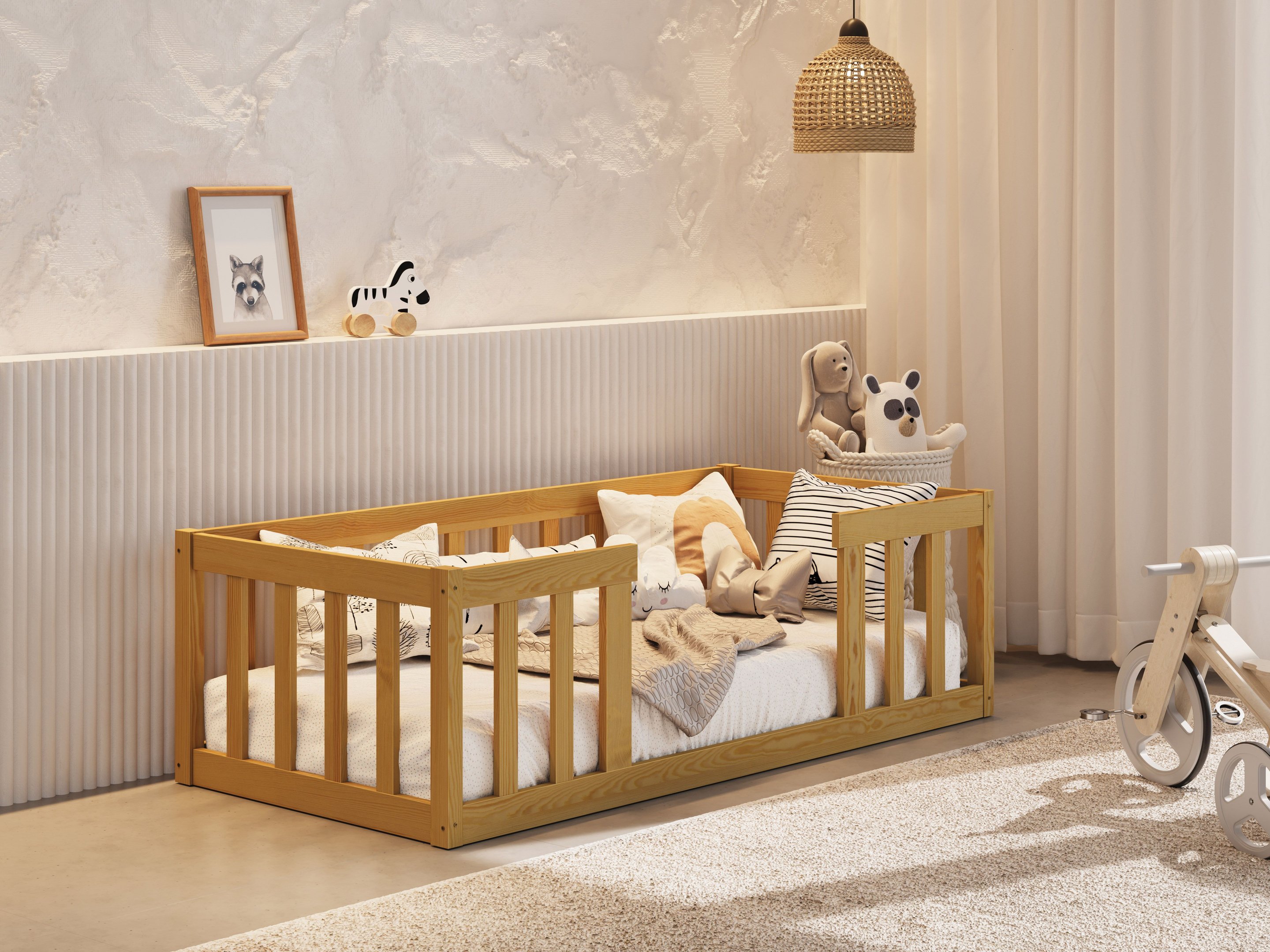 Cama Infantil Montessoriana com Grade de Proteção Madeira Luxo Quarto da Criança Cercado Cor Nature