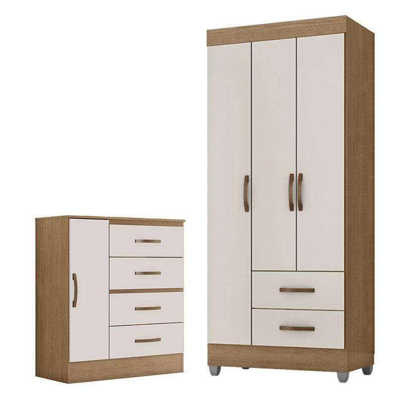 Guarda Roupa Solteiro 3 Portas e Cômoda 4 Gavetas Lite Nature Off White – Móveis Leão