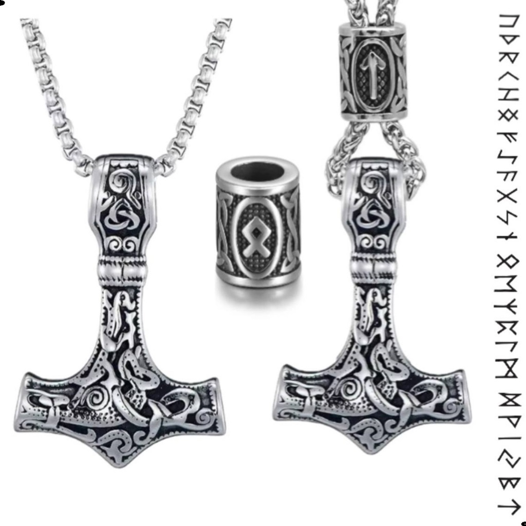 Colar Corrente em Aço Inoxidável e Martelo do Thor de Metal Liga - Machado Runas Viking Ragnar Odin