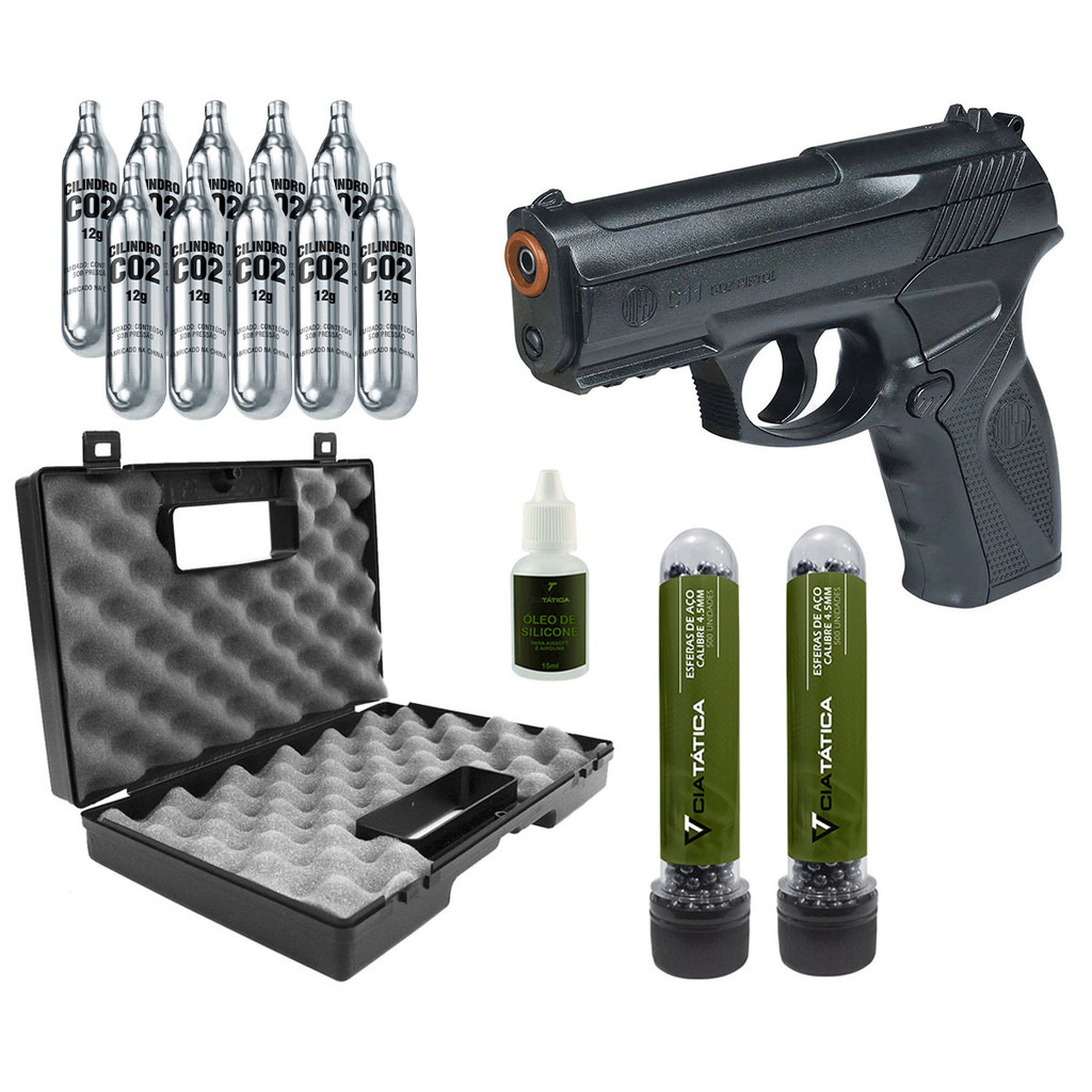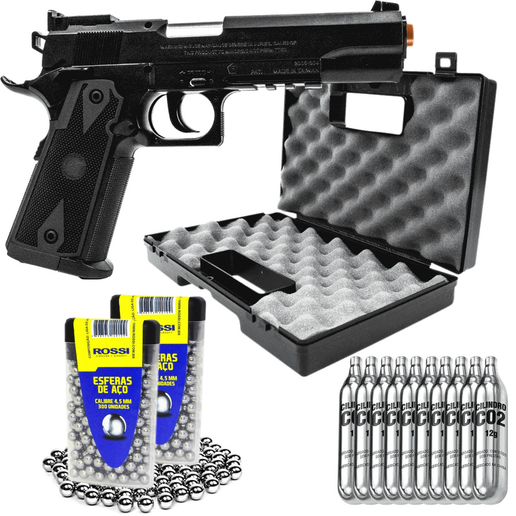 Pistola Rossi C11 4.5mm Arma Co2 Airgun 428fps com Maleta Rígida, 10 Co2 12g e 1000 Esferas Aço