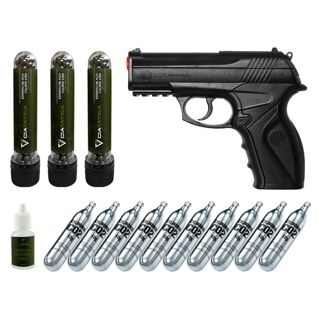 Pistola Rossi C11 6mm Arma Co2 Airgun Semiautomática com 10 Cápsulas 12g e 600 Esferas de Aço