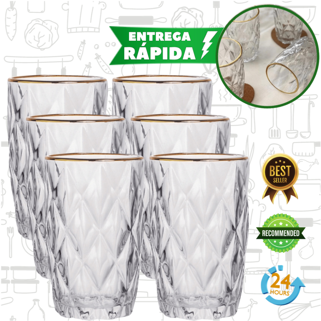 kit 6 Copos 360ml De Vidro Com Borda Dourada Detalhe de Diamante para beber suco, agua, refrigerante moderno de luxo para casa