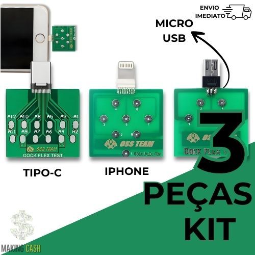 Dock Teste para Celular Kit com 3 Placas para Testar Conector de Carga do Iphone, Micro Usb e Tipo C