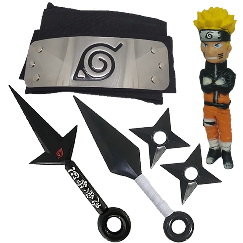 Kit Boneco do Naruto + 2 Kunais + 2 Shurikens + Bandana Vila da Folha