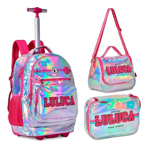 Kit Mochila de Rodinhas Luluca Holografica Com Lancheira Termica e Estojo Clio