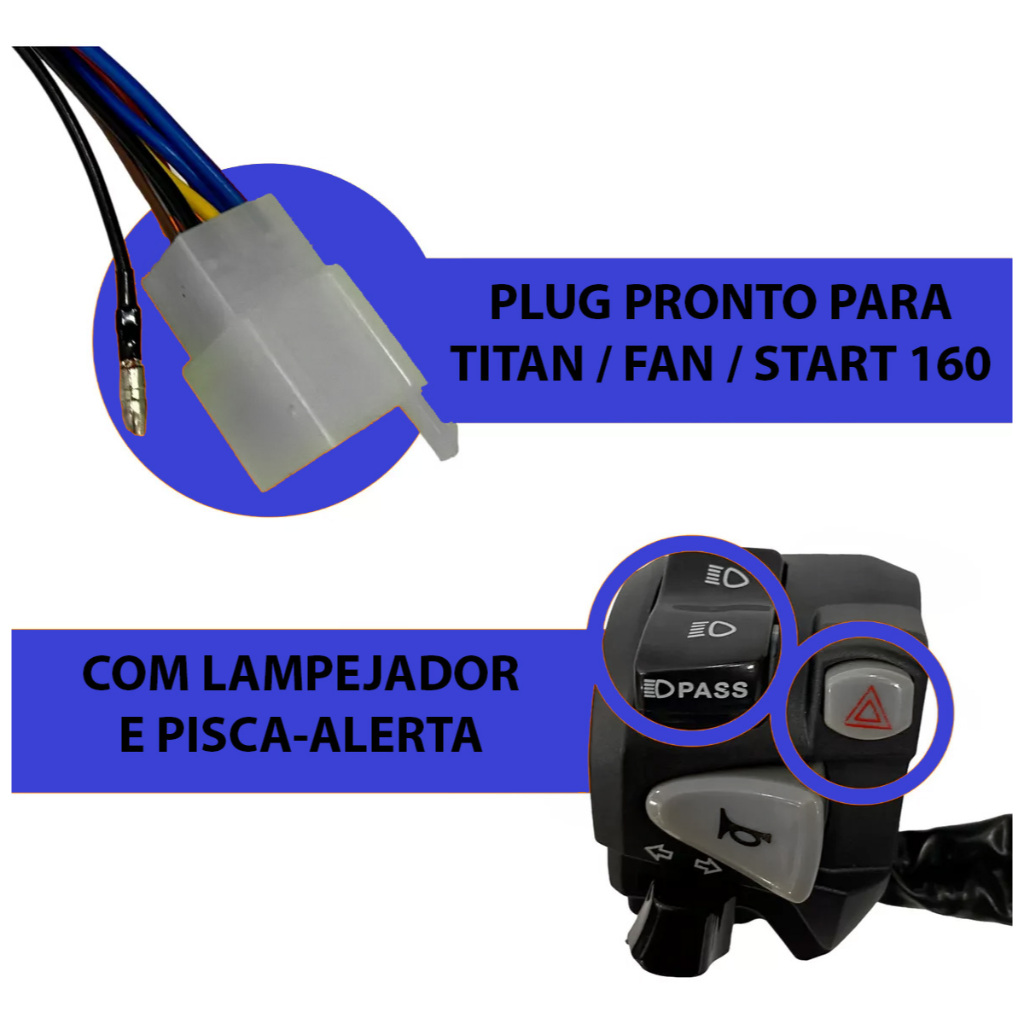 Kit Punho Luz XRE 300 Com Lampejador + Punho De Partida Cb 500 Titan Fan Start 150 160 Xre Cb 300 Com Plug