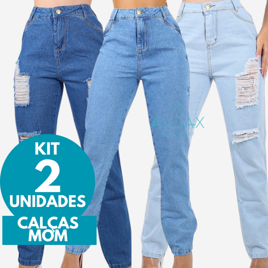 KIT 2 Calças Jeans MOM Cintura Alta Levanta Bumbum 100% Algodão Cós Alto Sem Lycra
