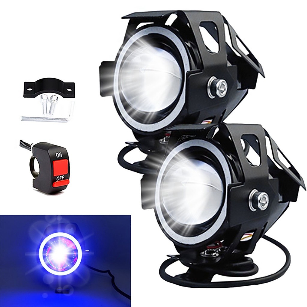 Kit 2 Farol Grande Milha U7 Olho Anjo Led Azul Angel Eye Moto Carro Strobo Com Punho Interruptor e Suporte Universal
