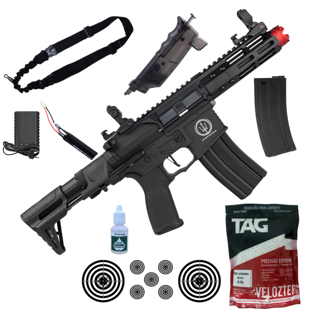 Rifle Airsoft Ar15 Neptune PDW ET 6mm Elétrica Rossi + 5000 Bbs + 3 Alvos + 1 Speed Loader + 1 Bandoleira + 1 Silicone