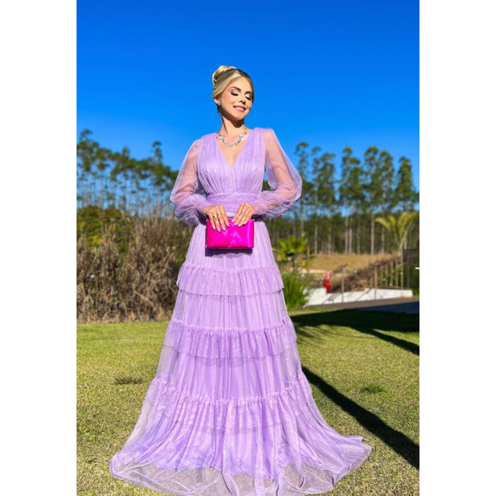 Vestido de festa lilas lavanda madrinha formatura casamento manga longa babado tres maria