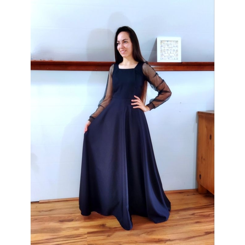 Vestido de festa longo moda evangélica com mangas, madrinha, casamento
