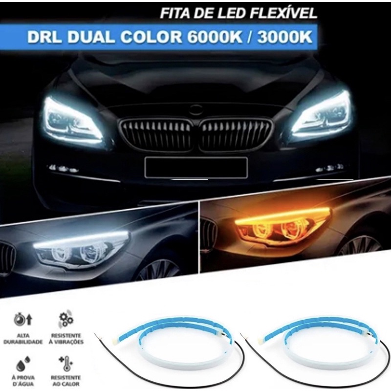 Par Fita Led Seta Sequencial DRL Dual Color Luz Diurna 60cm 6000k Seta Sequencial Lanterna para Farol Carro Universal 12V 30W com Efeito Cortesia Start Ghosting Seta Pisca Alerta Alto Brilho 150 LEDS 60 Centímetros 6000k Led Flexível