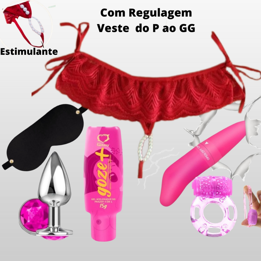 Sex Shop Calcinha Tailandesa Fio Dental Perolas + Vibrador Feminino Golfinho + Plug Anal de Metal + Gel Excitante Acelerador de Prazer Feminino Goze Mais 4 em 1 + Anel Peniano Vibrador + Tapa Olho