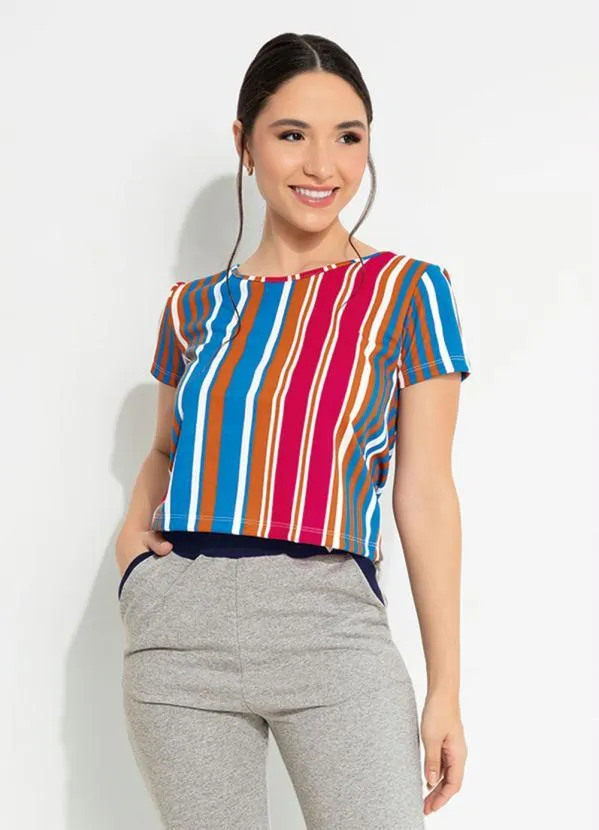 Moda Pop - Blusa Listrada Azul com Mangas Curtas