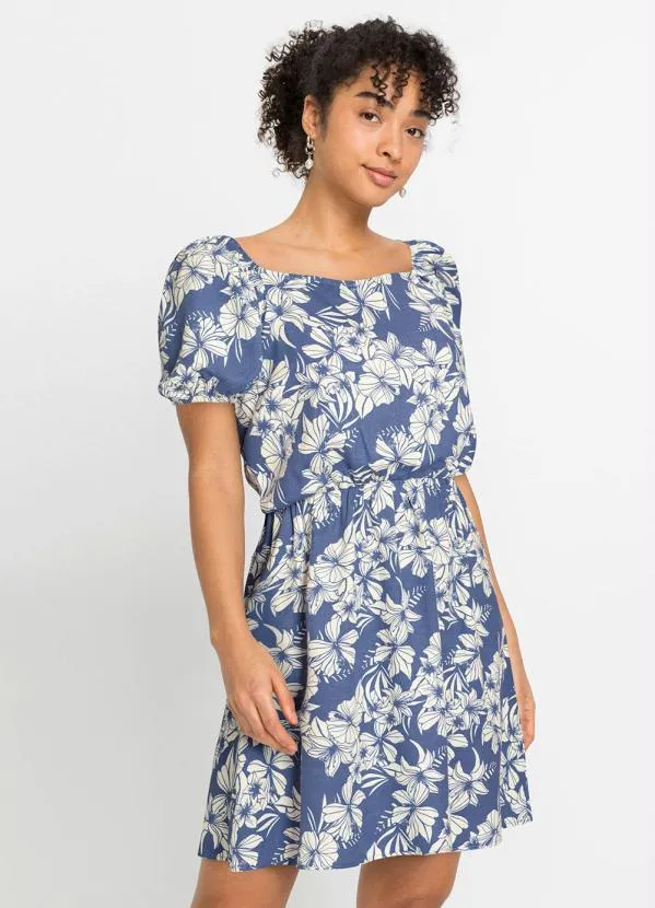 bonprix - Vestido Decote Quadrado Folhagem Azul