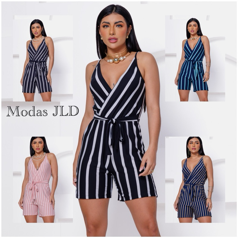Macaquinho Feminino Listrado em Viscolycra com Alças e Elástico nas Costas - Moda Casual