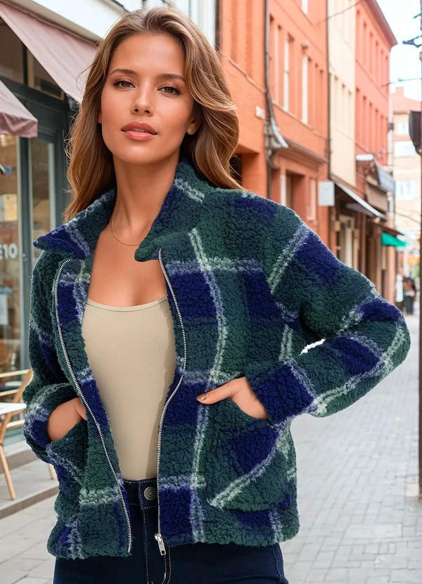 bonprix - Casaco Xadrez Verde em Malha Plush