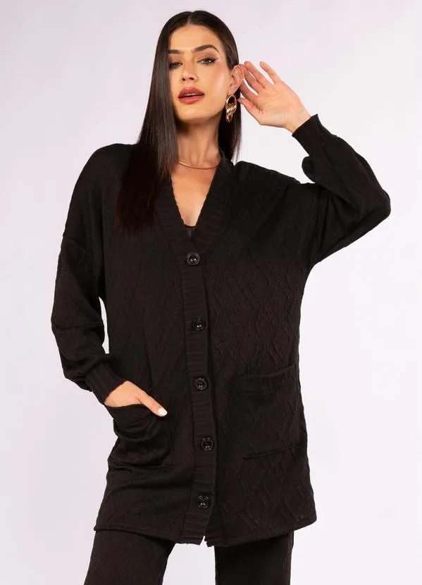Doce Trama - Cardigan Alongado em Tricot Preto
