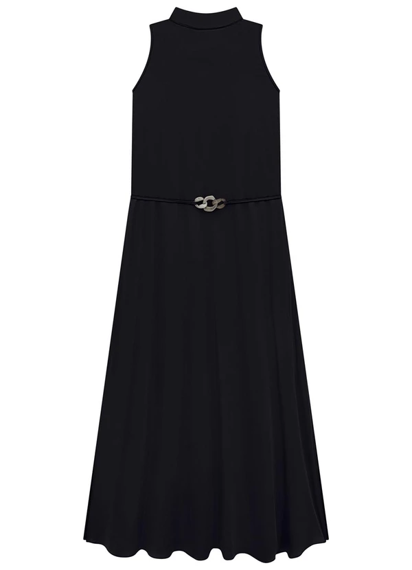 Lunender - Vestido Midi Gola Alta Evasê com Cinto Preto