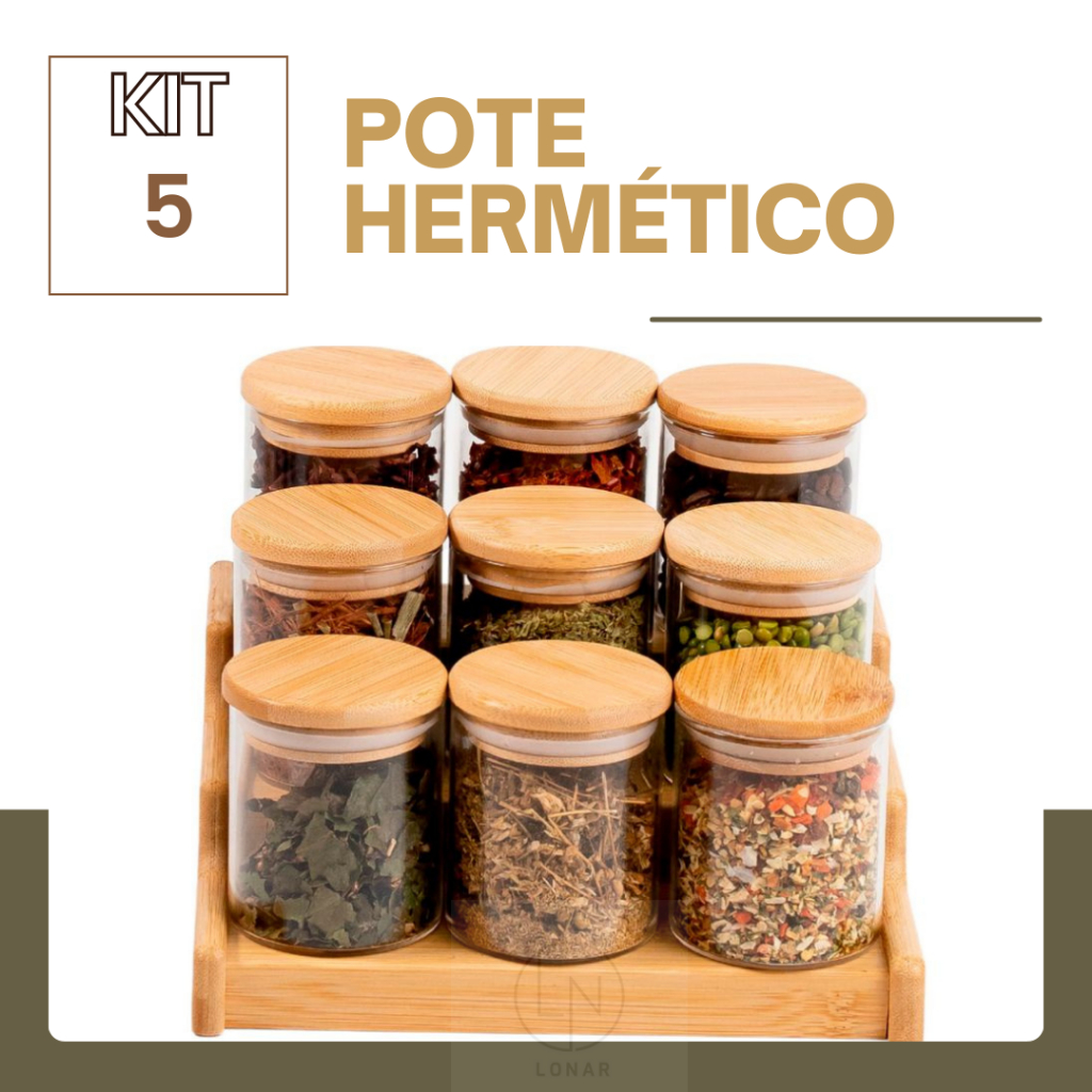 kit 5 Potes de Vidro Hermético P/ Mantimentos C/ Tampa Bambu 250ml