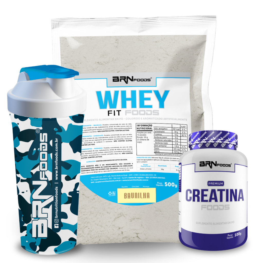 Kit Whey Protein Concentrado em Blend Proteico 500g + Premium Creatina 100g + Coqueteleira BRNFoods