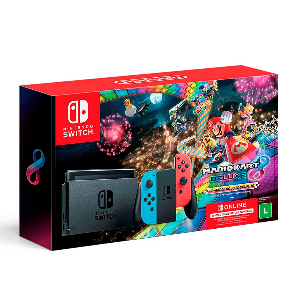 Console Nintendo Switch + Joy-Con Neon + Mario Kart 8 Deluxe + 3 Meses de Assinatura Nintendo Switch Online, Azul e Vermelho - HBDSKABL2