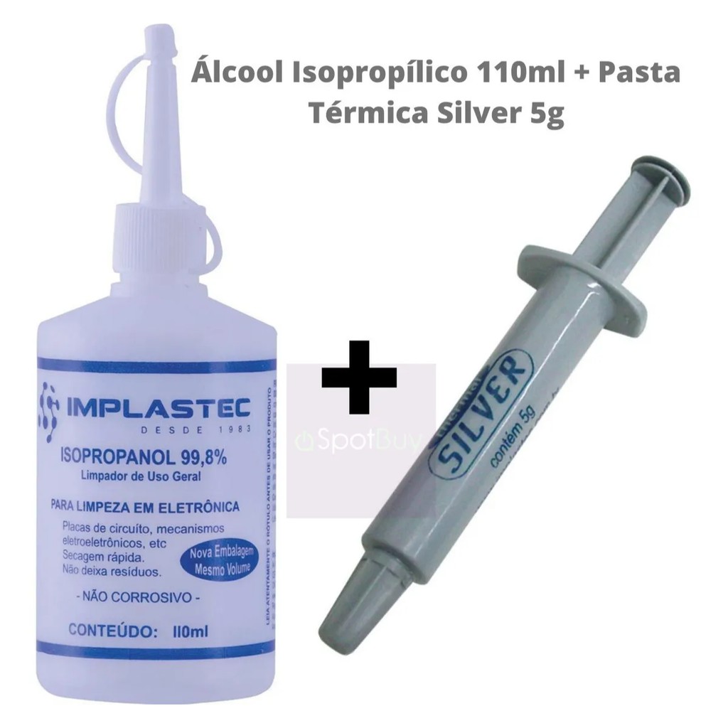Kit Alcool Isopropilico Puro 99,8% Implastec + Pasta Térmica Cinza Seringa Thermal Silver 5g