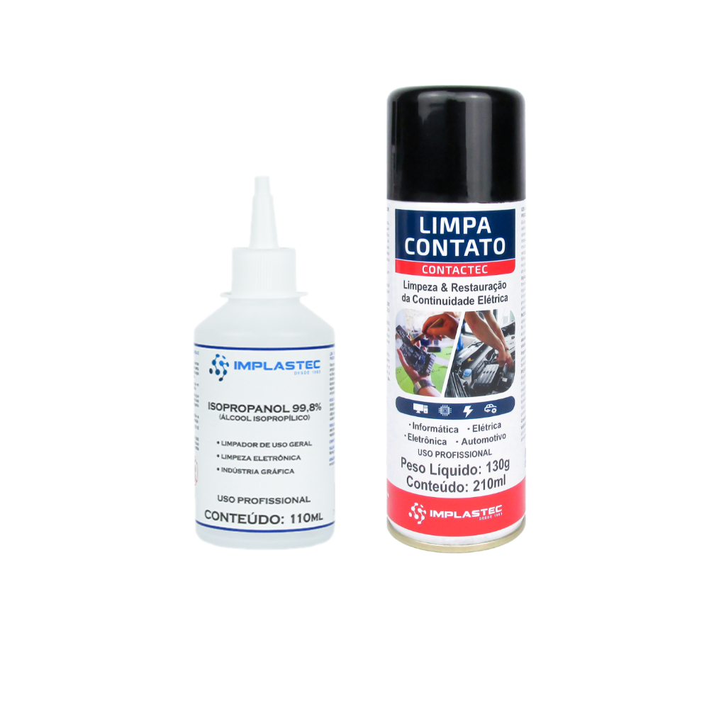 Kit Álcool Isopropilico / Isopropanol 99,8% Implastec 110ml + Limpa Contato Implastec Contatec Aerossol 210ml para Limpeza de Eletrônicos PCB Circuitos Placas PCI