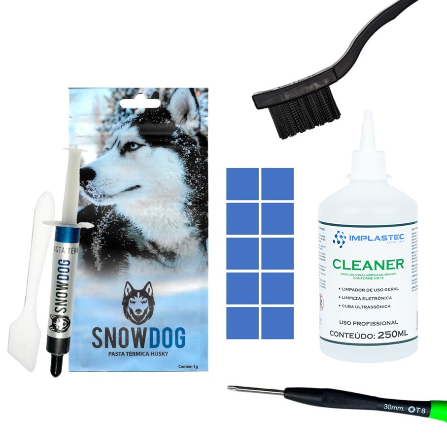 Kit Pasta Térmica SnowDog Husky 12,8 W/mk + Cleaner Implastec 250ML + Thermal Pad 10x10mm + Chave Torx T8 + Escova Antiestática Seringa Alta Condutividade Térmica Alto Desempenho