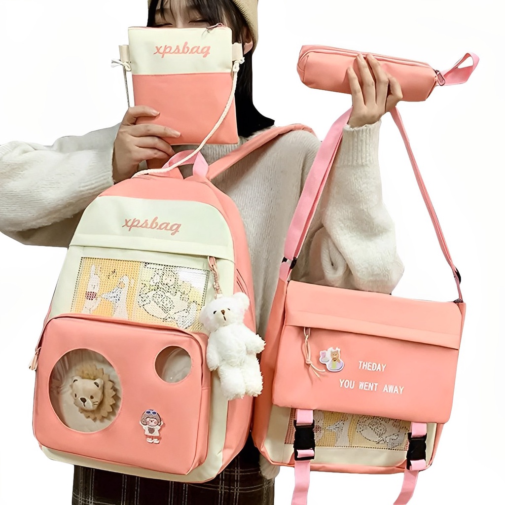 Kit Bolsa Escolar Feminina 4 Peças com Chaveiro de Ursinho Botons Mini Bolsinha Estojo Estilo Coreana Resistente Volta as Aulas