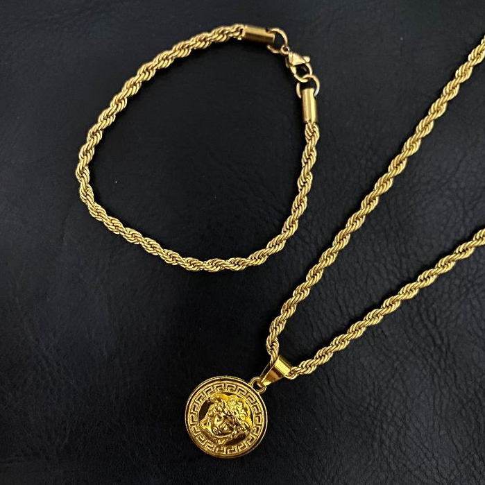 Corrente Masculina Cordão trançado Baiano 60cm Aço inox Com Pingente Medusas Corrente banhada a Ouro