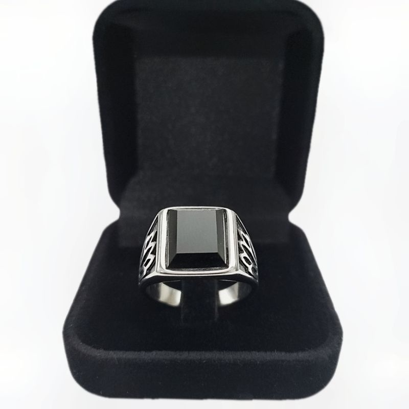 Anel Masculino Pedra Preta Dedeira Aço Inox Prateado C/Caixinha