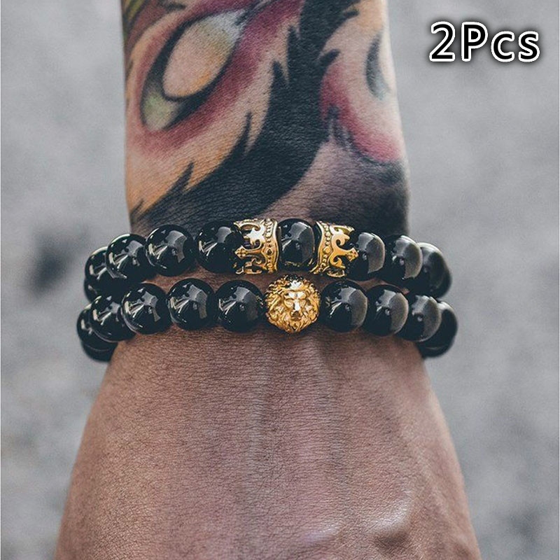 J & L 2 Pçs / Conjunto Pulseira Fashion Jóias Charme Liga Natural Pedra Coroa Leão Cabeça Pulseira Conjunto Para As Mulheres