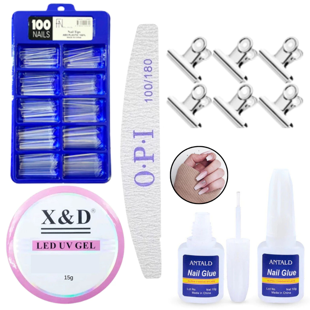 Kit Manicure Alongamento De Unha Com 100 Tips Postiça Curva C Cola Pincel 1 lixa 100 180 Gel Led UV