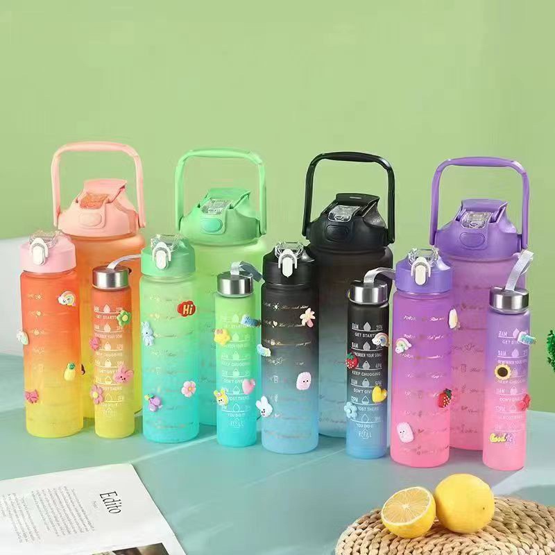 Kit com 3 Garrafa De Agua Com Adesivos Lembretes 3d,QUALIDADE BOA, 2000ML+900ML+500ML, a garrafa de 2L tem 2 bico,As garrafa maior e média vem os canudos,Vem anel de vedação
