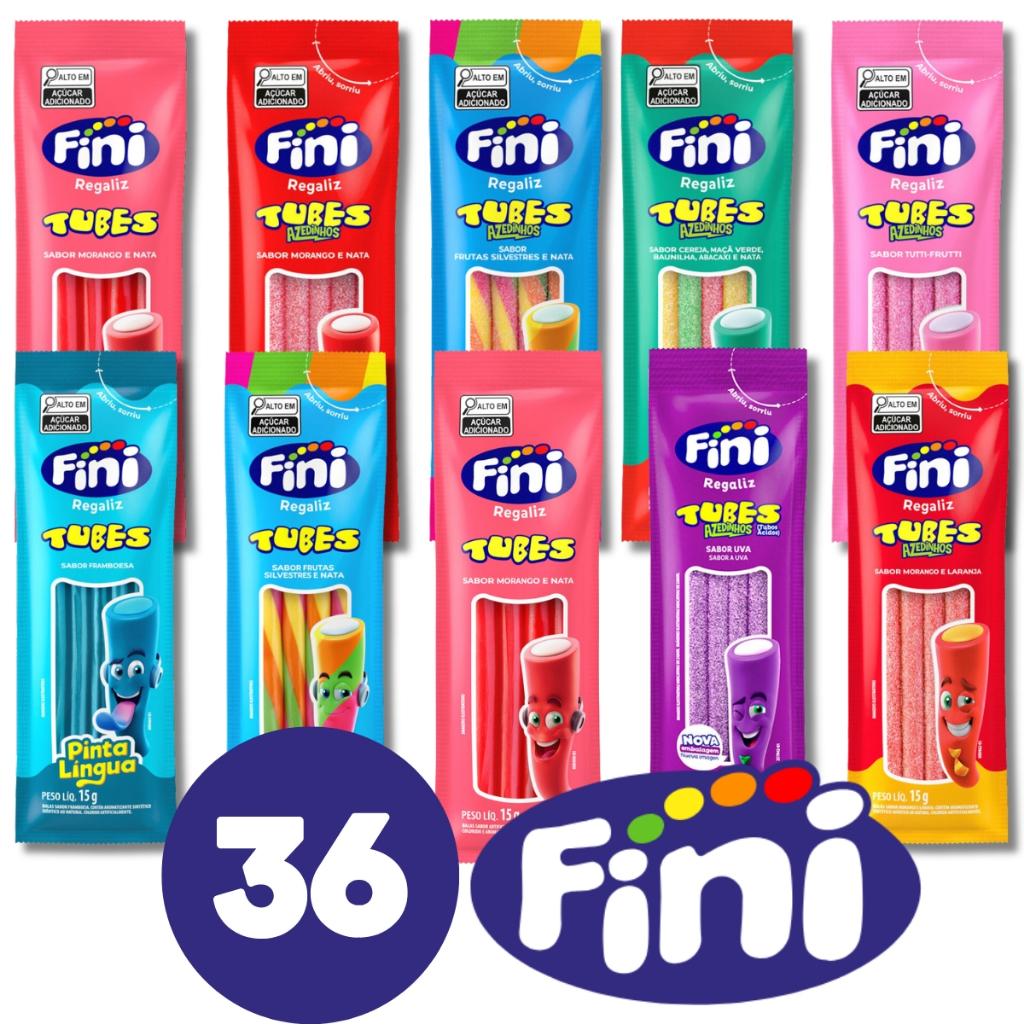 Kit Fini Tubes 36 Unidades Sabores Sortidos Cítricas e Doces Balas de Gelatina 15g Fini