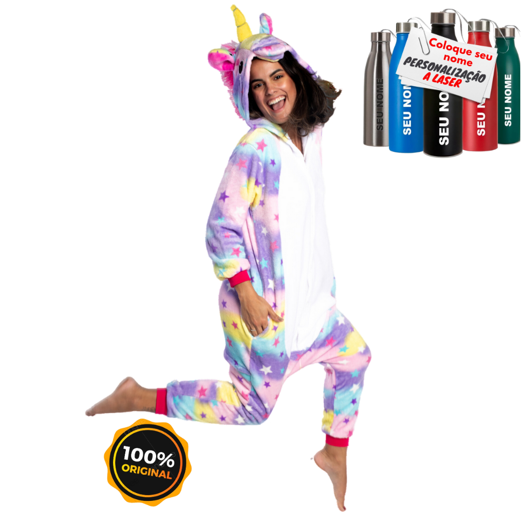 Pijama Macacão Adulto e infantil Unicórnio Estrelinha Kigurumi Cosplay + Squeezer de aluminio personalizada