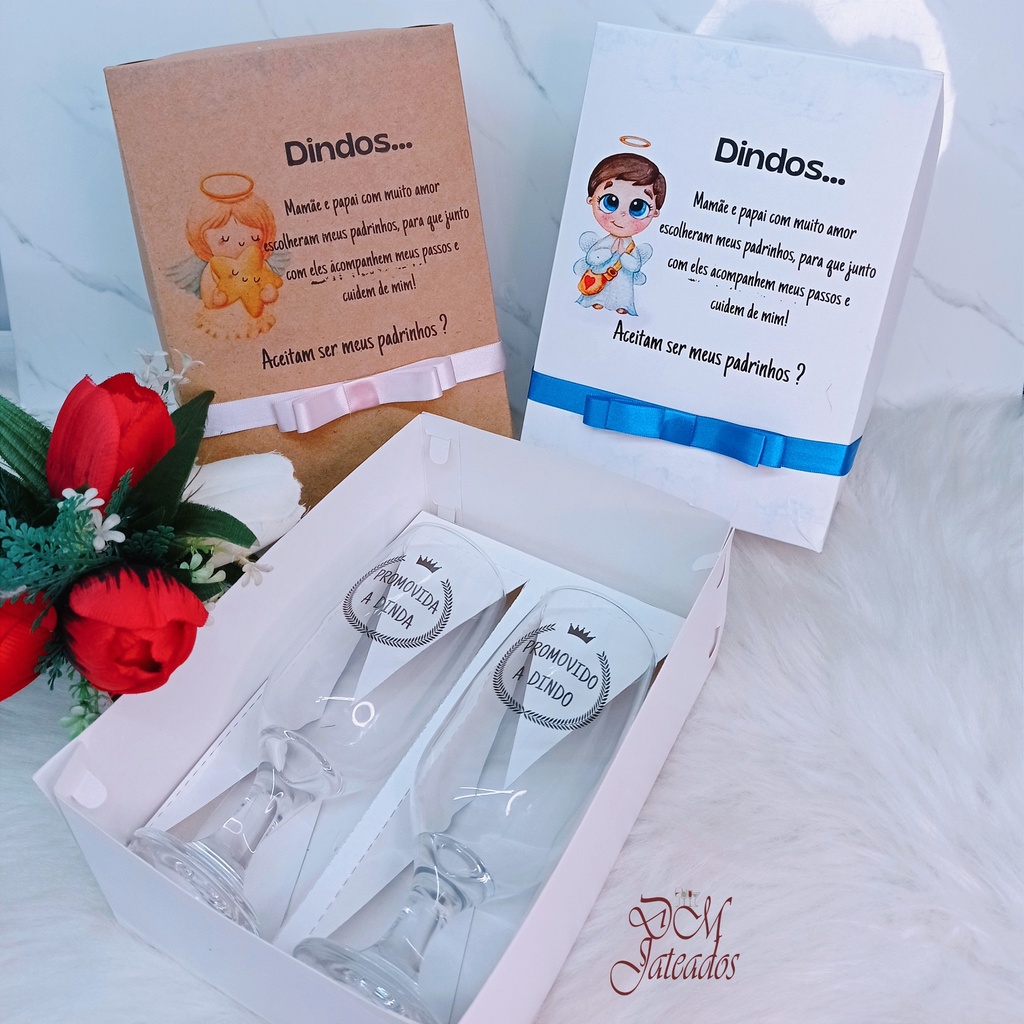 Taças de Cerveja com Caixa Convite Padrinhos Dindos Batismo Batizado Dinda Dindo