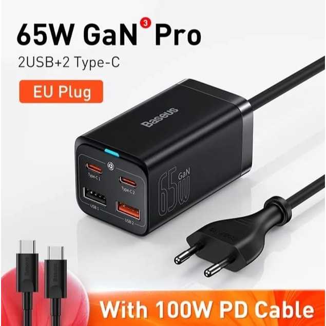 Baseus 65w Carregador rápido tecnologia GaN3 Pro + cabo Type C 1 metro para macbook ipad iphone android