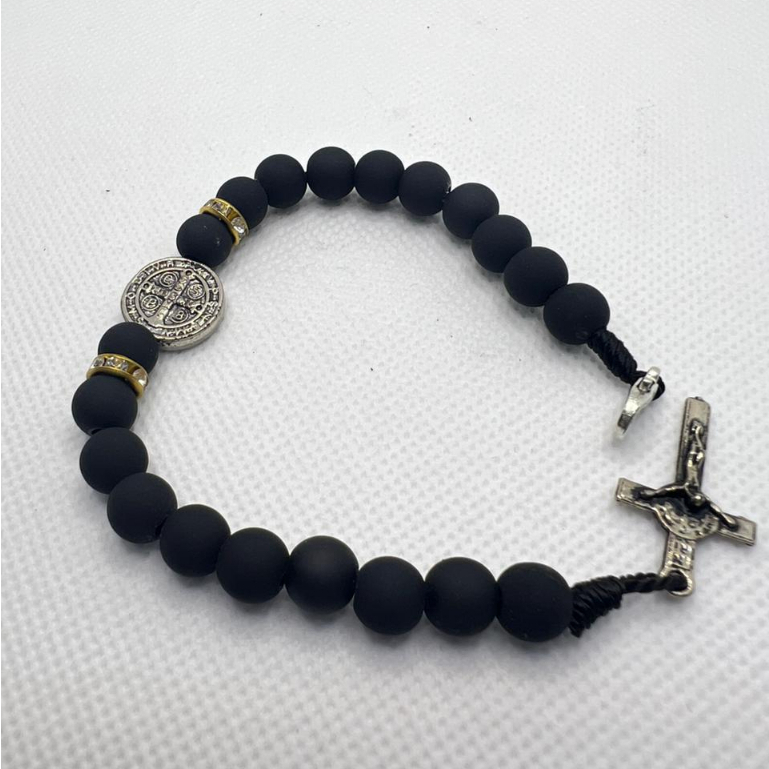 Pulseira Masculina/Feminina São Bento Perola Preta Emborracha, Cruz Metal