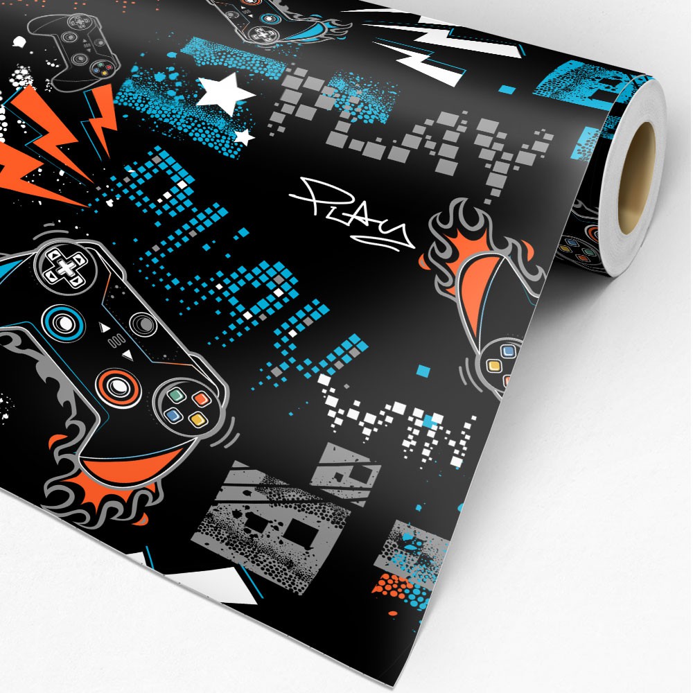 Papel de Parede Gamer Play no Jogo Decoração Quarto Menino Infantil Teen Colorido Fundo Preto