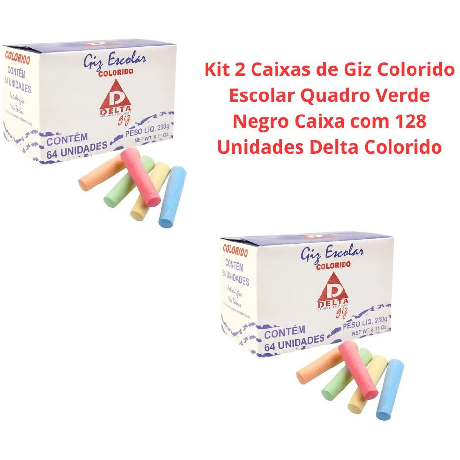 Kit 2 Caixas de Giz Colorido Escolar Quadro Verde Negro Caixa com 128 Unidades Delta